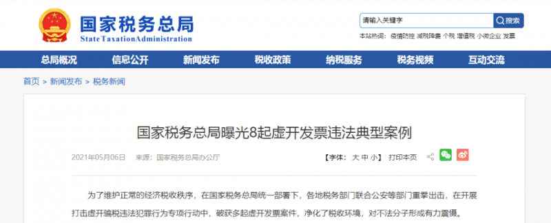 2021年5月,税务总局曝光8起虚开发票违法典型案例,涉及四川、深圳、北京、湖南、重庆、浙江、上海、江苏等地,中国政府网、央视新闻等集中进行了报道。